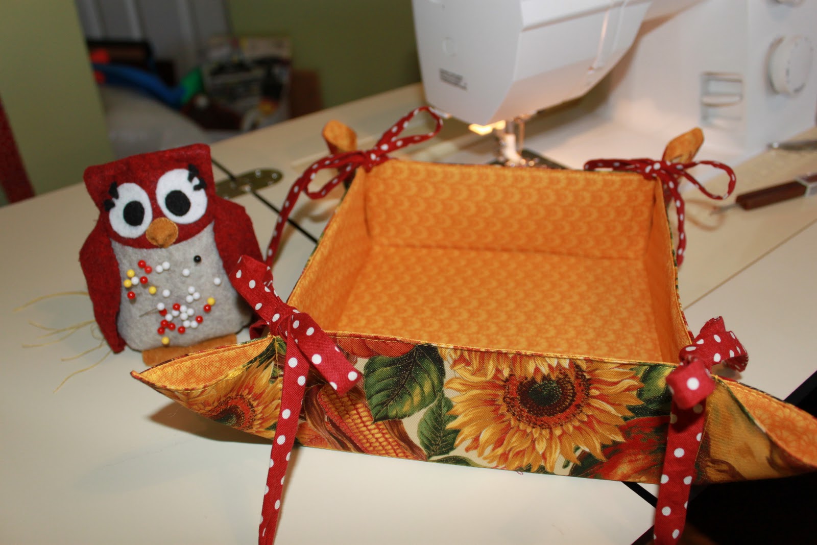totally be different without our fun movie lines. A few weeks ago I mentioned that I signed up for another apron swap with a fall theme. Well on Monday I received my Secret partner's info. She says that she loves all things fall. So I went shopping yesterday and found this great fabric with sunflowers, wheat, pumpkins, and apples with highlights of thin metalic gold. It seemed perfect! The colors are so rich and deep! Then I used red polka dots to add some fun and used the same golden yellow of the sunflowers for the lining. The apron is completely reversable! This super cute Retro apron pattern is a free download that you can find here. It's such a girlie pattern. I