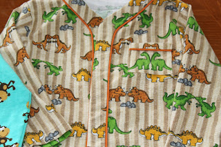 It's drizzly and overcast outside so that makes it a perfect day to have a pajama jam! I've been enjoying some yummy coffee that Jose made for me before he left for work today along with some wonderful pumpkin cranberry bread I baked this morning. It's about 2:30pm right now and I"m still wearing my jammies while I sew some jammies for David. His birthday is November 22nd and I'm working on a Dinosaur gift theme for him. If you've read some of my earlier posts, you'll remember that he talks about his 2 dinosaurs. He even acts like he's moving 2 very heavy objects around :) When I