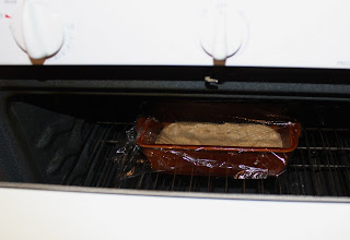 While the dough is "working" in the machine, spray your bread pan with olive oil. ( I use a 10" by 5" bread pan for a 1 1/2 pound loaf) I found this great ceramic bread pan at the thrift store as well.